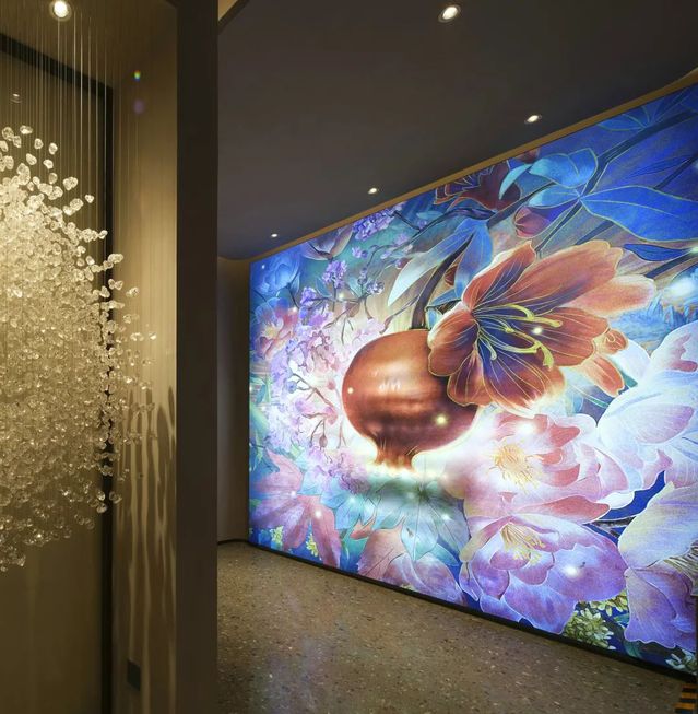 “人間歡喜事,石榴成熟時”,藝術(shù)生活館中一幅瑰麗絢爛的手繪花神圖渲染出主題氛圍,鮮花簇?fù)眍w粒飽滿石榴的畫幅,姹紫嫣紅中,將奧體公司開發(fā)的奧體新城各小區(qū)名稱中的植物元素有機組合在一起,觀眾置身其中,仿佛能聞到花的芳香、看到石榴籽的晶瑩剔透。畫面寓意著花開興隆、興旺昌盛,祝福幸福美好生活紅紅火火,也體現(xiàn)了河西集團(tuán)“開發(fā)幸福、運營美好”的經(jīng)營理念。整幅花神圖由特邀手繪師親繪而成,十分珍貴。