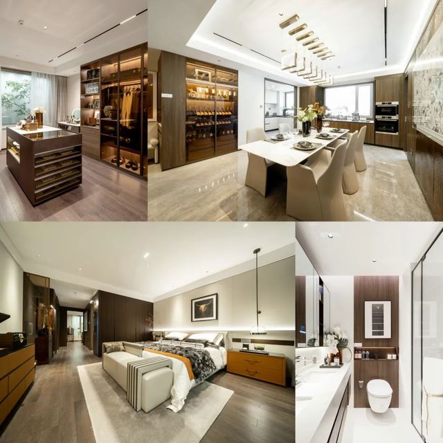 此次公開的樣板間為265㎡奢華四房兩廳三衛(wèi)雙陽臺戶型,在戶型研發(fā)和飾面材料使用上,設(shè)計團(tuán)隊都針對主要客戶人群的需求,經(jīng)過反復(fù)斟酌,對細(xì)節(jié)處理更是精益求精,成為奧體公司迭新之作。硬朗的石材紋理與沉穩(wěn)的木飾面碰撞出豐富的層次變化,加上墻面局部銅制捶打紋飾面和內(nèi)嵌式金屬開關(guān)面板,營造低調(diào)奢華的現(xiàn)代風(fēng)格。
